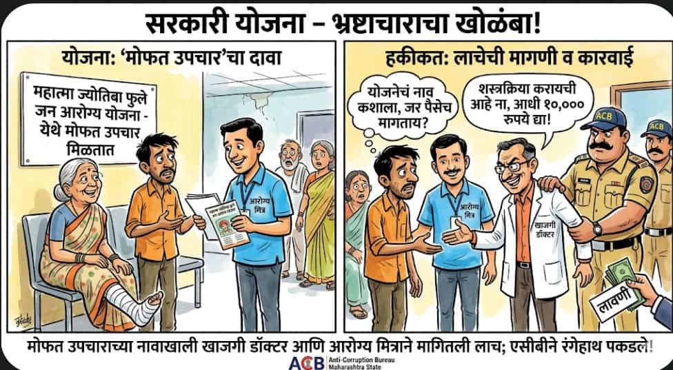 सोलापूर (प्रतिनिधी) – महात्मा ज्योतिबा फुले जन आरोग्य योजना अंतर्गत मोफत उपचार मिळणे बंधनकारक असतानाही शस्त्रक्रियेसाठी लाचेची मागणी केल्याप्रकरणी मंगळवेढा येथील खाजगी डॉक्टर व आरोग्य मित्राविरुद्ध गुन्हा दाखल करण्यात आला आहे. या कारवाईमुळे आरोग्य व्यवस्थेतील गैरप्रकार पुन्हा एकदा उघडकीस आले आहेत.