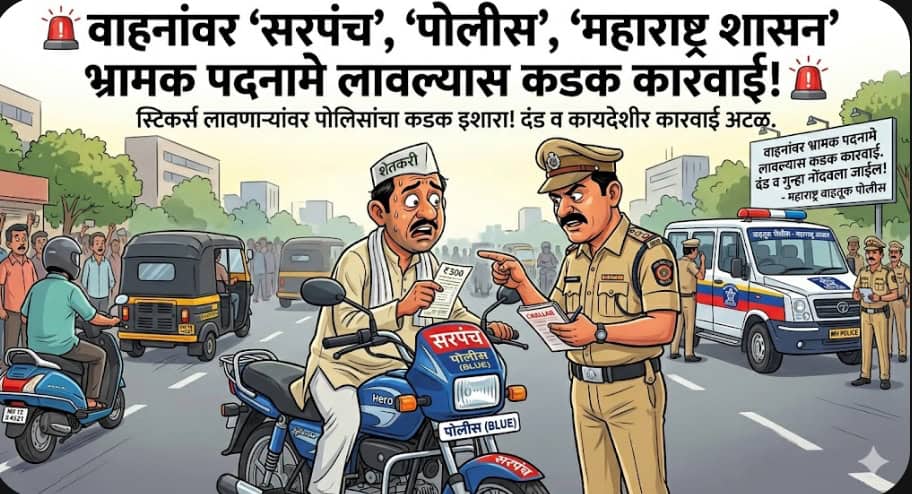 राज्यात खाजगी वाहनांवर “सरपंच”, “पोलीस”, “महाराष्ट्र शासन” अशी पदनामे किंवा ओळख दर्शविणारे स्टिकर्स लावण्याचे प्रकार वाढत असून, यावर वाहतूक पोलिसांनी लक्ष केंद्रित केले आहे. संबंधित प्रकार हे नियमबाह्य व भ्रामक स्वरूपाचे असल्याने अशा वाहनचालकांवर दंडात्मक कारवाई केली जात आहे.