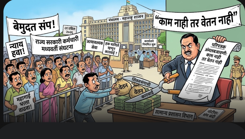 मुंबई : राज्य सरकारी कर्मचाऱ्यांनी २१ एप्रिल २०२६ पासून पुकारलेल्या बेमुदत संपाच्या पार्श्वभूमीवर महाराष्ट्र शासनाने कठोर भूमिका घेत “काम नाही तर वेतन नाही” हा नियम लागू करण्याचा स्पष्ट निर्णय घेतला आहे. सामान्य प्रशासन विभागाने यासंदर्भात अधिकृत परिपत्रक जारी करून सर्व विभागांना तातडीने अंमलबजावणीचे निर्देश दिले आहेत.
